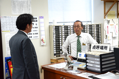 自動的に、年月日・社員コード・氏名が印字された日報が手渡される対面点呼の実施です